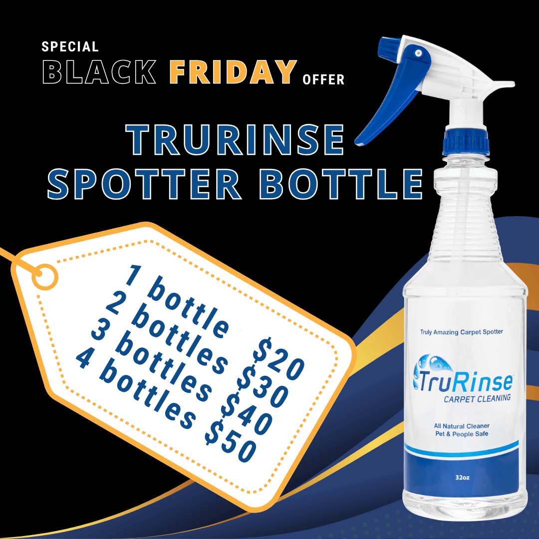 Get our all-natural TruRinse Spotter Bottle — the perfect cleaner for life’s spills and messes! Safe for carpets, upholstery, rugs, clothes, shoes, and more (just not leather). This 32 oz. bottle uses the same TruRinse Solution we use professionally to lift stains like oil, grease, pen ink, and pet messes without harsh chemicals. Stock up during our Black Friday Sale: 1 for $20, 2 for $30, 3 for $40, or 4 for $50. Give the gift of clean this holiday season!